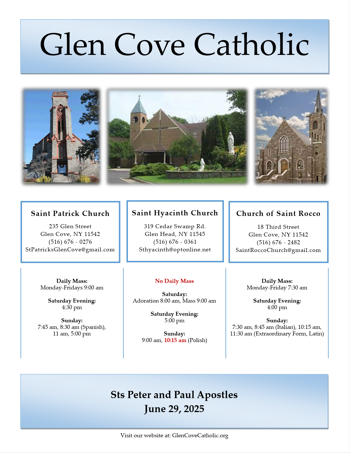 En Glen Cove Catholic, nuestros boletines parroquiales son su fuente de referencia para enterarse de las últimas noticias, eventos e inspiración. Cada semana, compartimos actualizaciones importantes, reflexiones espirituales y oportunidades para conectar con nuestra vibrante comunidad. ¡Manténgase informado y comprometido con nosotros!